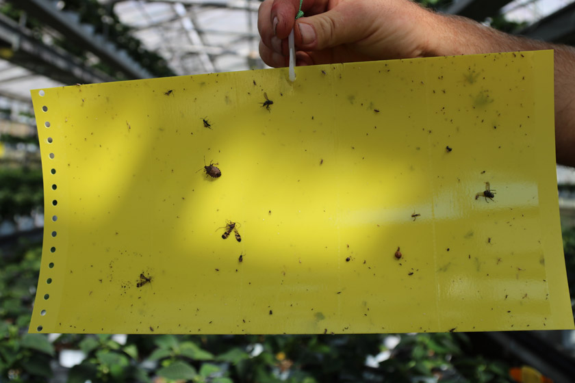 Striscia di trappola gialla per insetti con taglio a croce ed appesa ad un ferro sagomato artigianalmente .