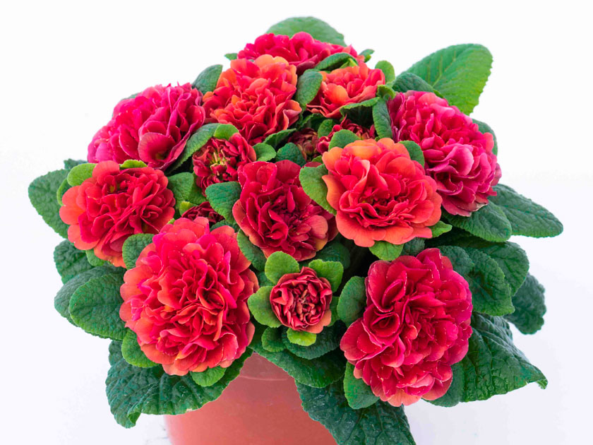 La Primula Belarina Carmen propone finalmente un bellissimo tono di rosso aranciato caldo e lunimoso. I fiori doppi sono circondati da una rosetta di piccole foglioline verde brillante.