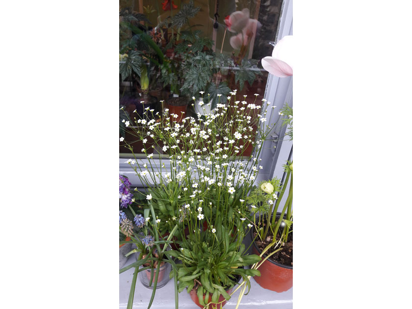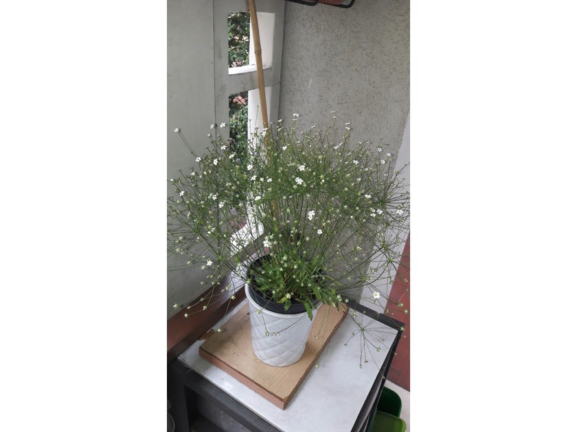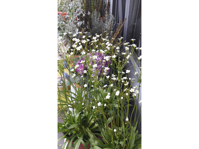 Steli alti una ventina di centimetri a forma di ombrello portano in punta eleganti fiori bianchi. L'effetto è quello di una gispofila con il vantaggio del volume decisamente più importante.