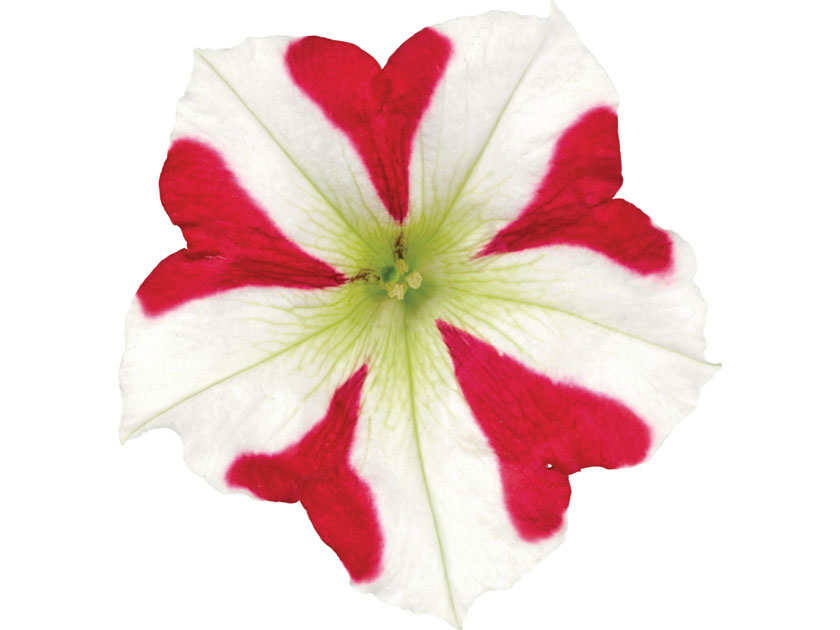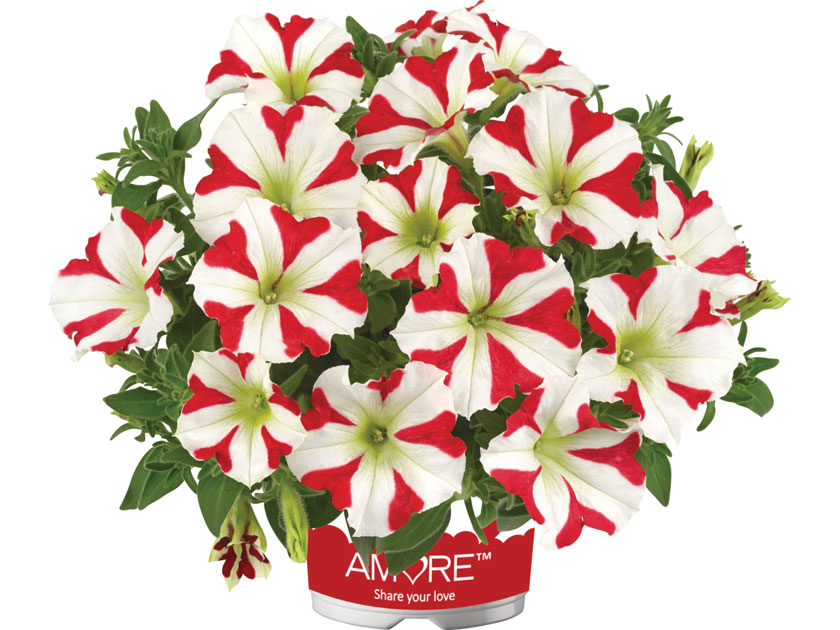 Nella Petunia Amore King oh Hearth una serie di cuori rosso intenso si stagliano sul resto del petali bianco puro. Un bicolore di sicuro effetto. Pianta campatta