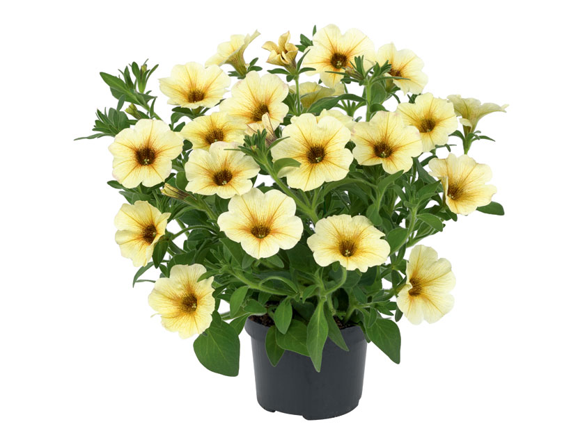 La Petunia interspecifica (Petchoa) Beauty French Vanilla è un ibrido tra petunia e calibrachoa. Colori quasi metallici, portamento a cuscino leggermente ricadente e ottima resistenza al caldo estivo..