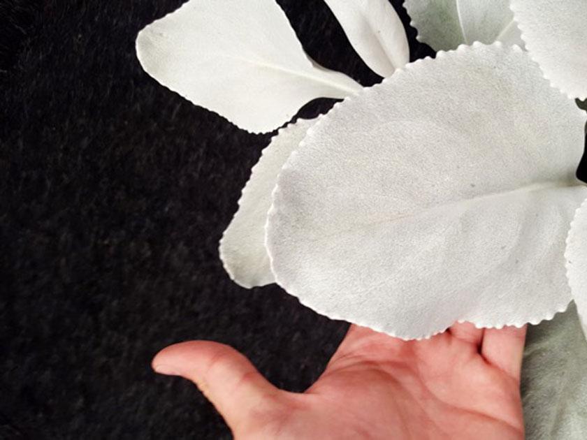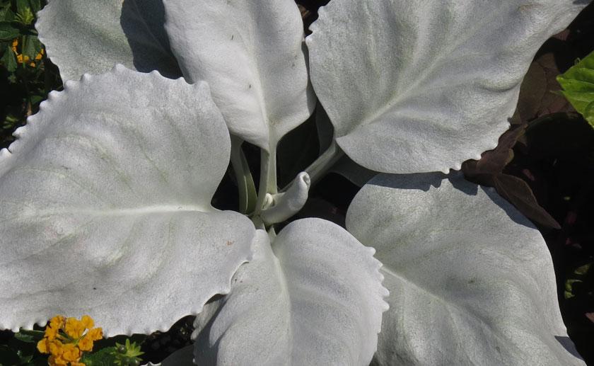 Il Senecio candicans “Angel wings” presenta delle grandi foglie inamidate ma morbidissime al tatto. La superficie sembra coperta da uno spesso velluto grigio quasi bianco. Resiste in giardino fino ai -10 gradi e non ha particolari esigenze riguardo al terreno se non un buon drenaggio.