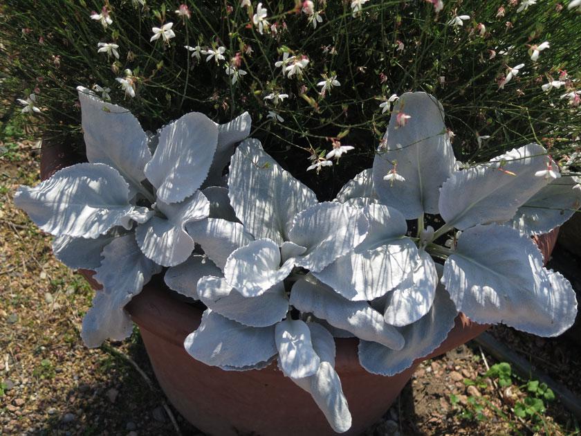 Piante di Senecio candicans “Angel wings” ambientate con gaura