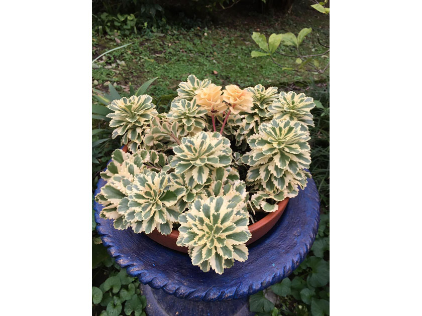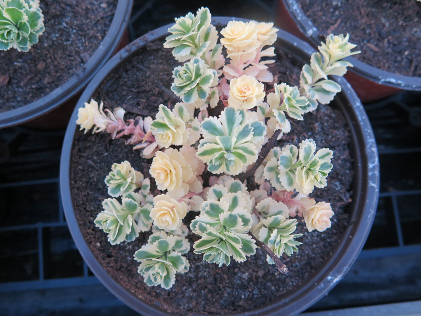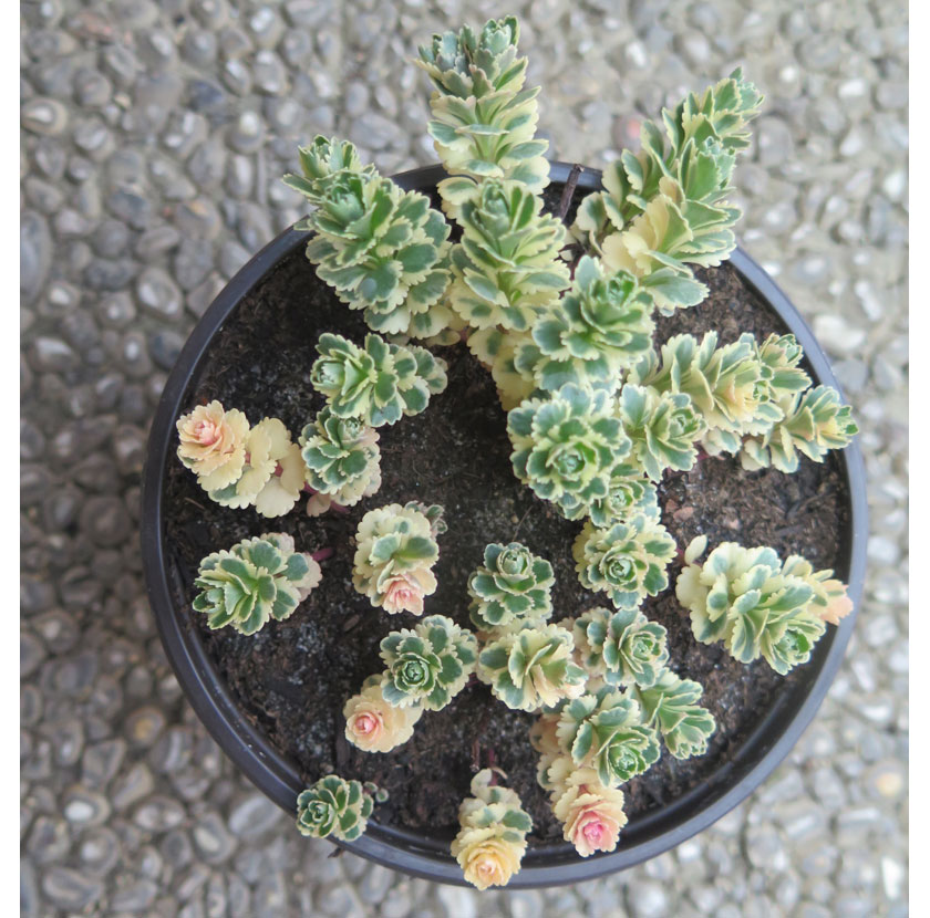 Nuovissima varietà di sedum perenne molto bella a foglia variegata. Richiede poca acqua. Esposizione in pieno sole. Fiorisce in piena estate. Perde la vegetazione in inverno.