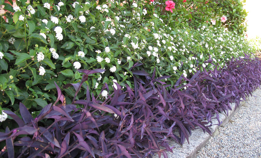 La Tradescantia pallida a dispetto del suo nome è una pianta con le foglie colorate di un bellissimo viola intenso con fiori rosa lilla portati alle estremità dei rami. Pianta voluminosa e poco “addomesticabile” si utilizza prevalentemente in grossi contenitori dove forma importanti macchie di colore.