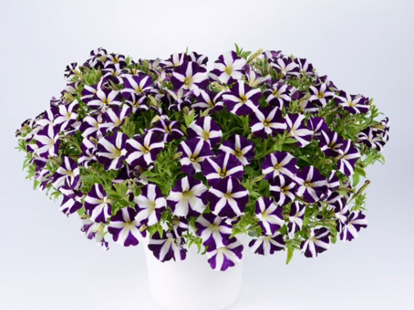 La Petunia Amore purple heart è un colore davvero unico nel panorama delle petunie ricadenti: sullo sfondo bianco sono disegnati dei bellissimi cuori porpora blu. Bella pianta ricadente robusta e ben ramificata. Colore molto stabile anche con alte temperature.