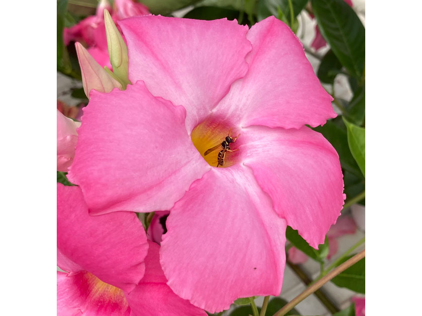 La varietà di Dipladenia Sundaville Cosmos pink è una pianta vigorosa che può essere utilizzata sia come ricadente importante (oltre il metro) sia come rampicante coprendosi per tutta l'estate in entrambi i casi di grandi fiori rosa.