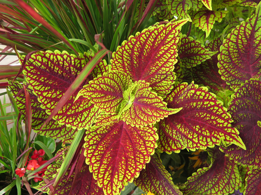 La caratteristica del Coleus da talea Golden Dream è di avere tutte le venature delle foglie rosse su un fondo che và da un verde chiaro a un verde oliva, con l'effetto di un importante ricamo.