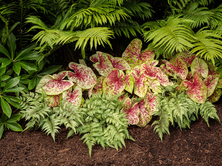 La nuova serie Fancy Leaf PW di Caladium è stata selezionata per offrire piante molto resistenti anche in fioriere o aiuole. Piante affascinati con foglie delicatamente colorate resistono senza problemi alle intemperie sia all'ombra che in posizioni di mezz'ombra grazie alle foglie decisamente più robuste rispetto alle serie classiche di Caladium. Sono piante che amano il caldo e sono da utilizzare quando la stagione estiva è avviata.