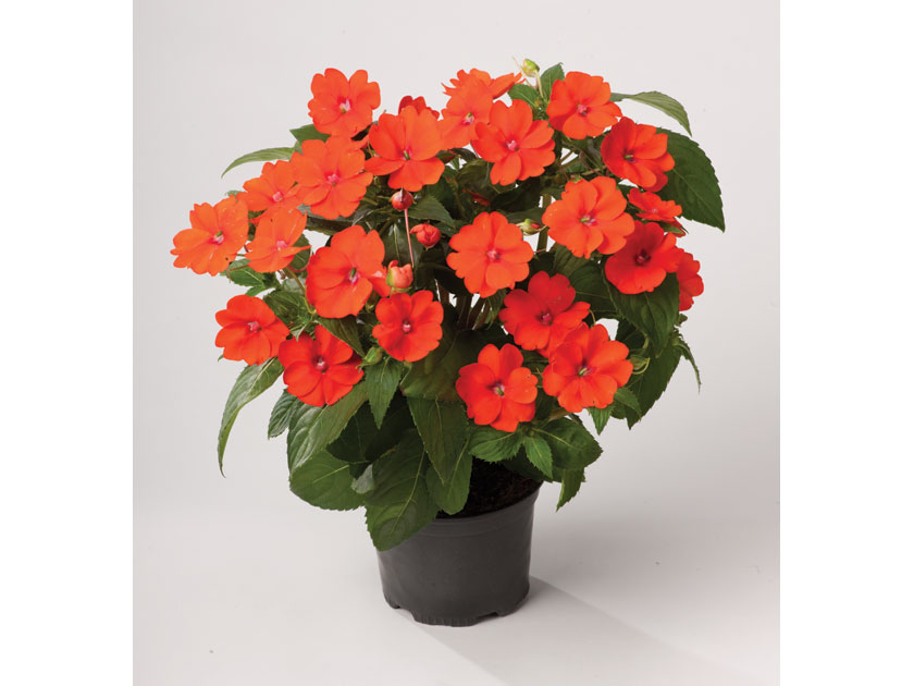L’impatiens interspecifico Sunpatiens vigoroso scarlet a foglia verde è una pianta di grande effetto scenico per il volume che raggiunge nel corso della stagione. Fino ai primi geli la pianta si copre di grandi fiori arancio. Pianta della categoria XXL.